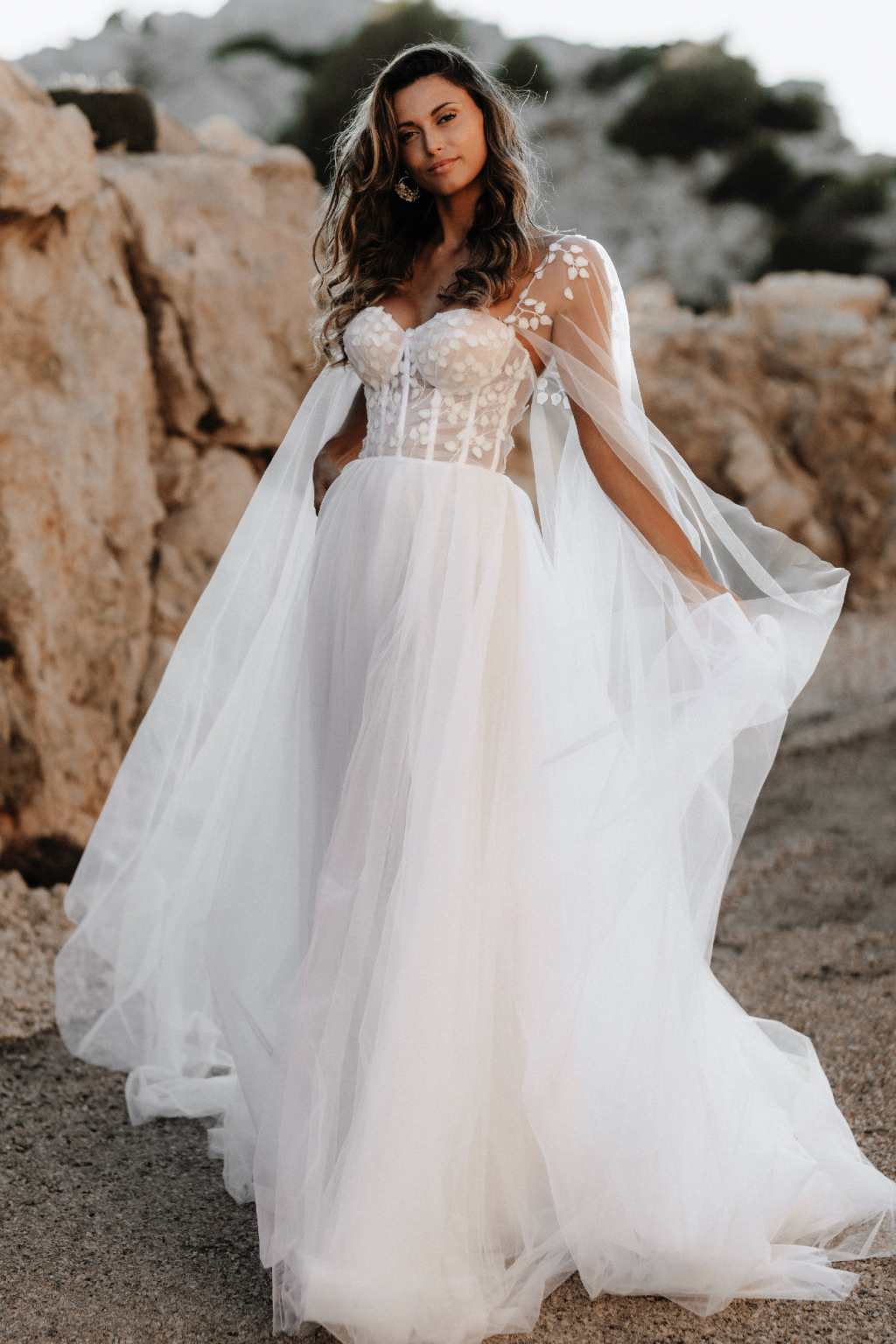 Šaty jsou ušité z lehce průhledného bílého lehounkého tylu zdobeného jemnou lístečkovou krajkou. Korzetový živůtek s přiznanými kosticemi a svůdným šněrováním na zádech doplňuje nadýchaná tylová sukně s hlubokým rozparkem. Model je variabilní – můžete si ho doplnit odepínacími dlouhými závojovými rukávy s krajkou a zcela jimi zakrýt ramena nebo je nosit ležérně volně spadlé.