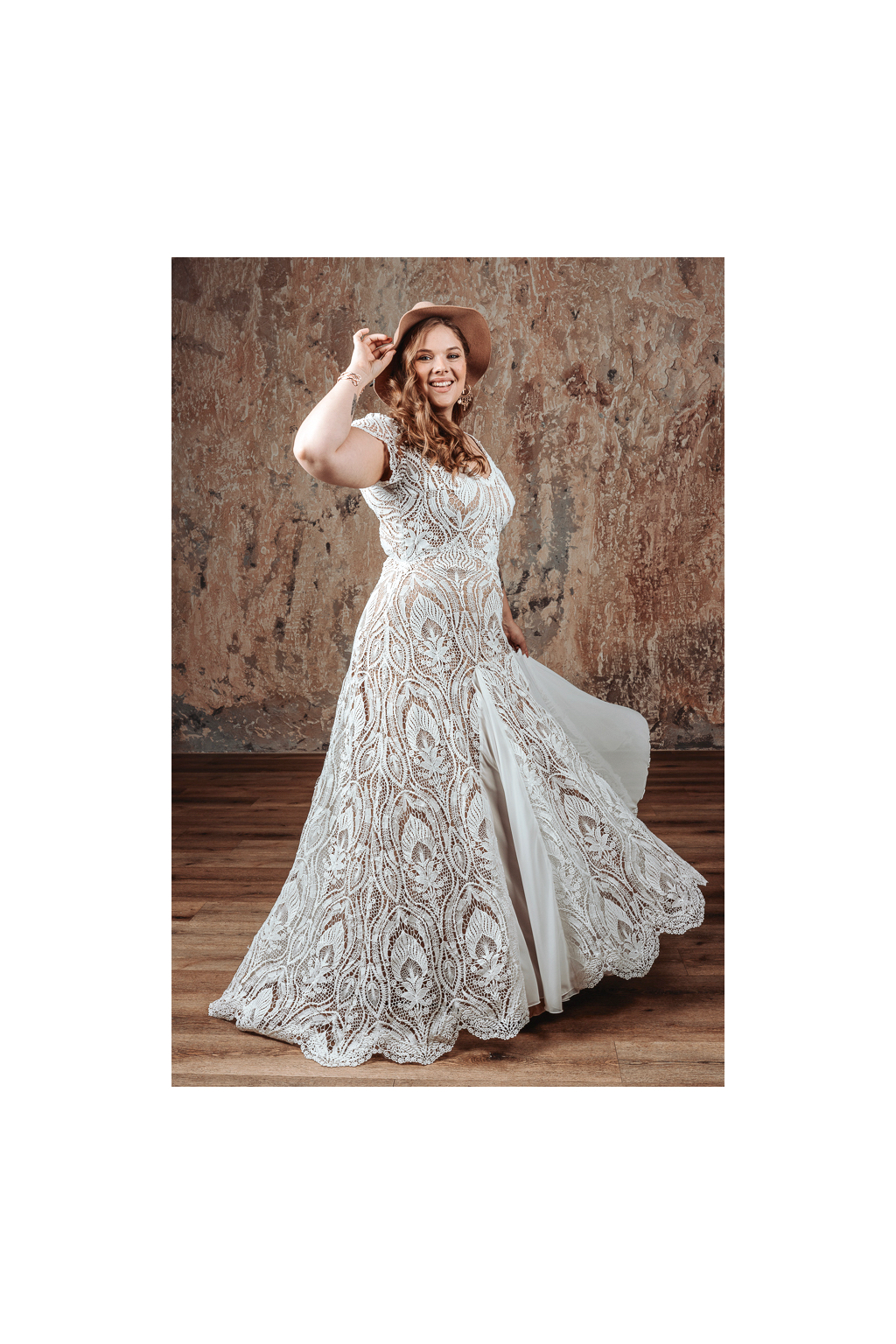Nebojíte se vyniknout a chcete, aby právě takové byly i vaše svatební šaty? Šaty MAYA jsou ušité z výrazné hrubší ornamentální krajky, která rozhodně upoutá pozornost. Sukně je v bocích vypasovaná a rozšiřuje se do dlouhé vlečky se vsadkami, která je zakončená lemováním s obloučky. Výstřih do V je obšitý jemným zdobením a širší ramínka jsou doplněna krátkými křidélky. Odvážně řešená odhalená záda a hluboký rozparek působí velice žensky a doplňují bohémský vzhled šatů. V plus size velikosti je zadní výstřih řešený tak, aby bylo možné si vzít pod šaty podprsenku.