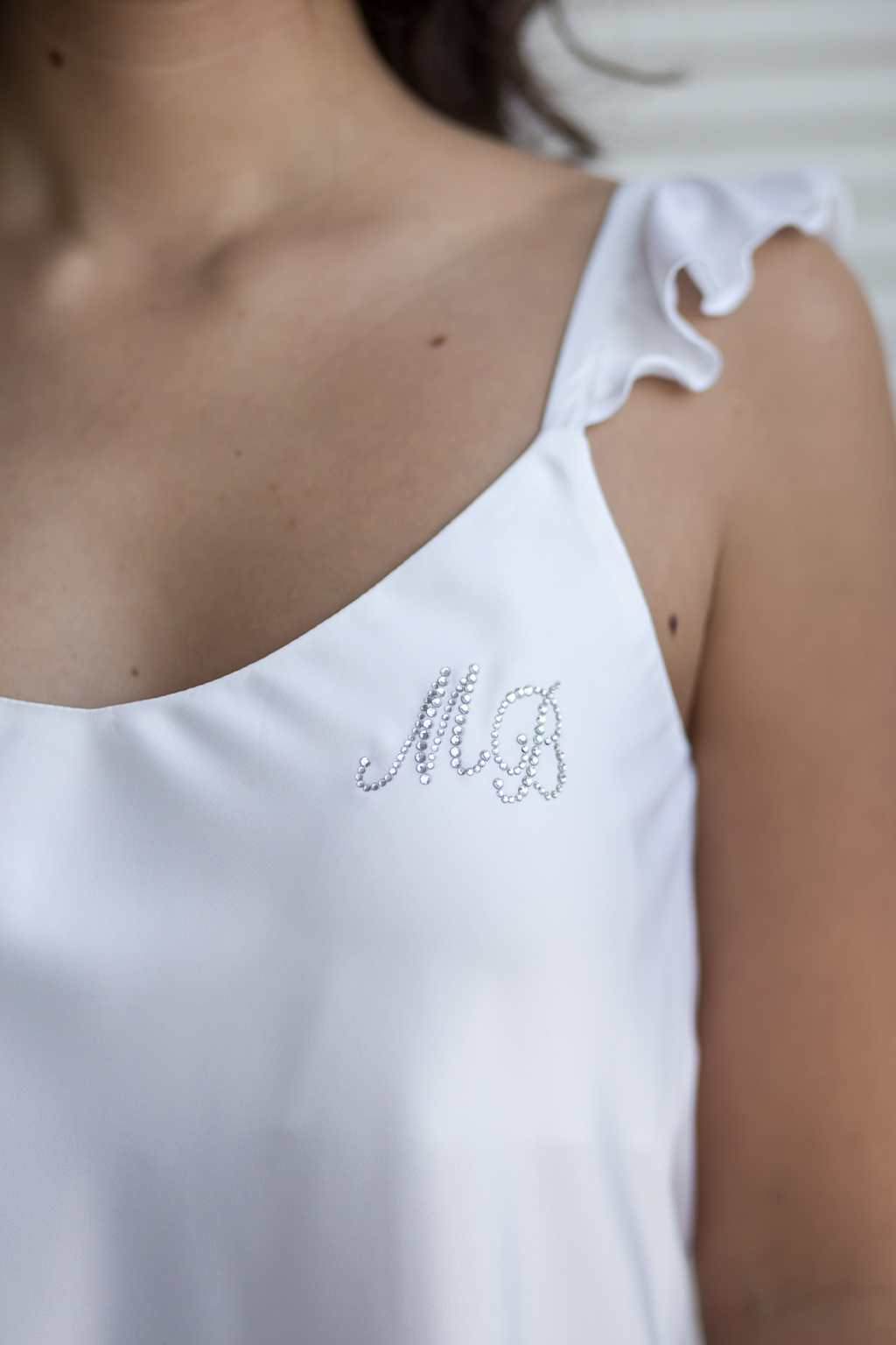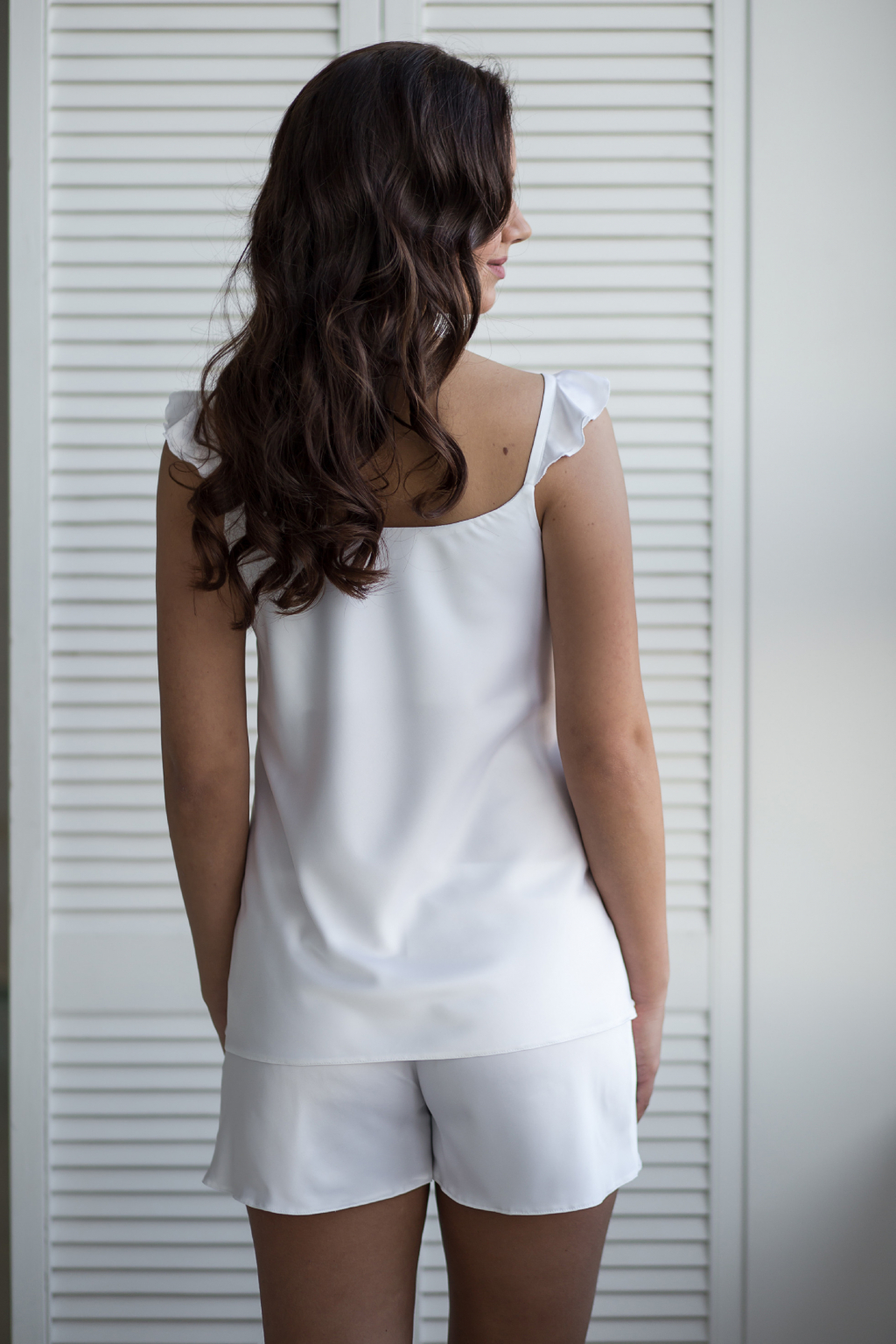 Luxusní pyžamový set je ušitý ze splývavého, jemného saténu s elastanem. Tílko je zdobené menšími volnánky na ramínkách. Na přání je možné ušít bez volánků. Kalhotky mají širší spodní okraj pro větší pohodlí a v pase jsou na gumičku. Pas není příliš řasený, aby kalhotky nerozšiřovali postavu. Pyžamo je možné doplnit monogramem.